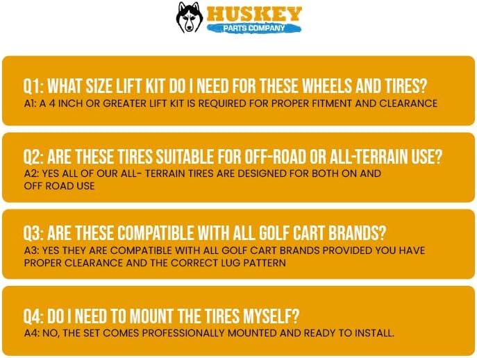 • 𝐓𝐞𝐫𝐫𝐚𝐢𝐧 𝐓𝐢𝐫𝐞 𝐓𝐫𝐞𝐚𝐝: Huskey golf cart tires are all 𝗗𝗢𝗧 𝗰𝗲𝗿𝘁𝗶𝗳𝗶𝗲𝗱 for a great on road & off-road experience. A 6″ or higher lift kit will be required to install these wheels on EZGO, Club Car and some other golf carts.