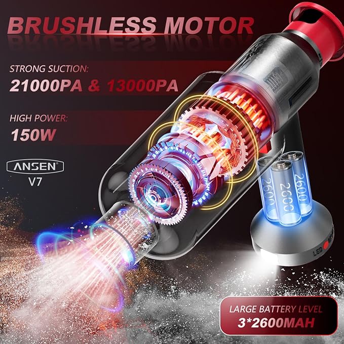 - 【High Power 21000PA Suction】This cordless car vacuum with brushless motor has 2 adjustable suction power modes of 13000PA & 21000PA, 150w. It features a double-turbine blade structure with a speed of up to 110,000 r/min. This handheld vacuum cordless equipped with brush extension rod and nozzle to help clean crumb, dust or pet hair in the cracks easily.