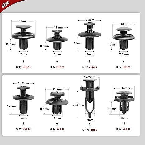 - UNIVERSAL FIT KIT: – Great assortment push retainer kit with 16 most popular size, fitting for door trim, radiator shield yoke, fender, bumper, side skirt, grille, engine cover and splash shield retainers replacement,compatible with Ford, GM, Chrysler, Toyota, Honda and more. All packed in a plastic container for easy organization and storage.