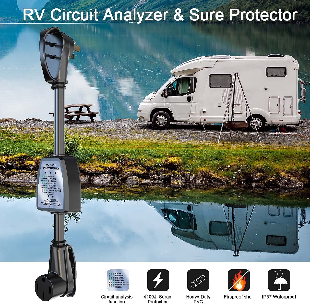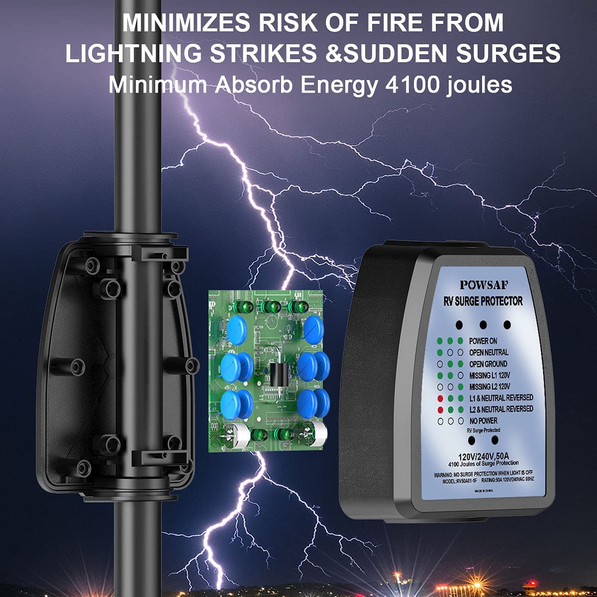 - 50 amp Waterproof Surge Protector for RV : Identifies faulty park power plus offers 4100 Joules of surge protector. Protects your RV from dangerous high and low voltage levels as well as power surges. Designed for outdoor use, Weather resistant, All weather shield assembly.