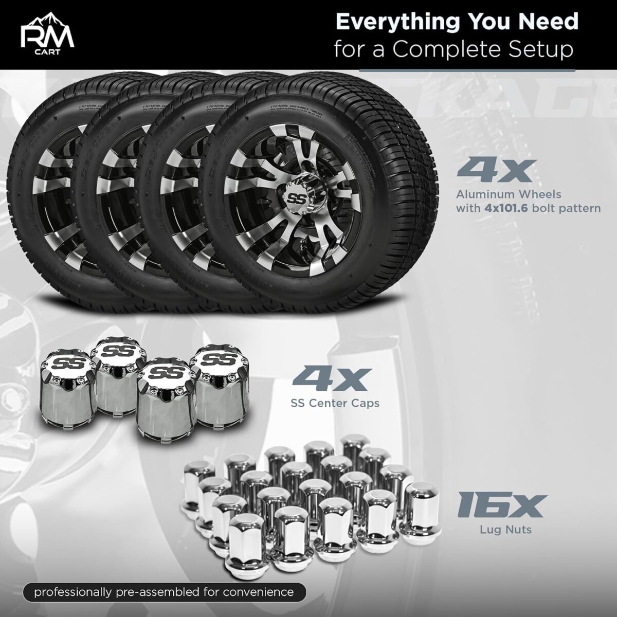 - Set of four (4) Black/Machined Warlock aluminum wheels, four (4) 205/50-10 Deli Low Profile tires, four (4) SS caps for wheels, and sixteen (16) standard lug nuts (Club Car & EZ-Go). Tires are pre-mounted on wheels before shipping.