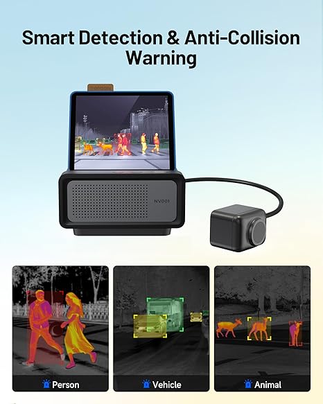 - Dynamic AI Collision Alerts: The NV001 features advanced AI that rapidly and accurately identifies pedestrians, vehicles, animals, and other road hazards. It employs a color-coded system with audio and visual warnings in green, yellow, and red to indicate the proximity and severity of potential threats, enhancing your driving safety.